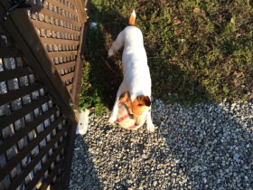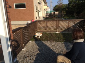 夏に作ったドッグランでは、レオンクンがハーブマットの上で、大喜び!